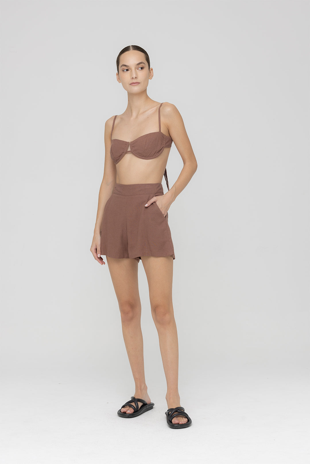 Set dos piezas de lino, con un top que se amarra en la parte trasera para brindar un mejor ajuste, acompañado de un short confeccionado en la misma tela.