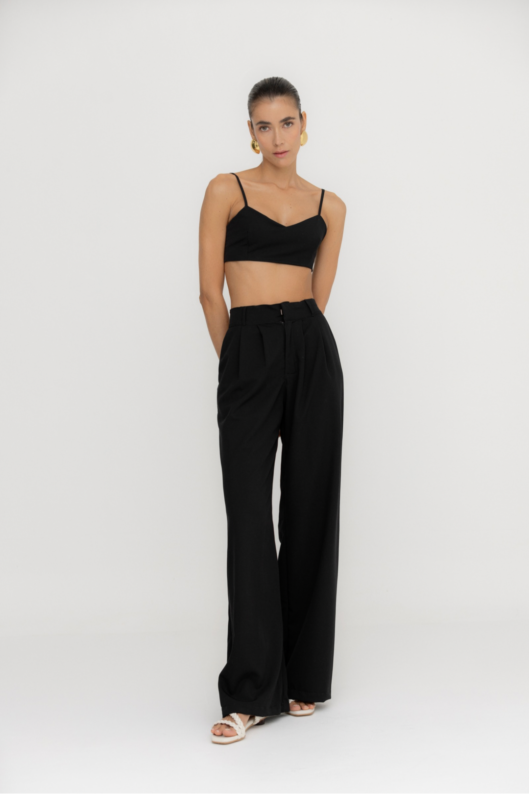 Conjunto de piezas en poliéster que incluye un pantalón de tiro alto, confeccionado con técnicas de sastrería, que proporciona un ajuste relajado en las piernas y presenta bolsillos laterales funcionales. Este conjunto se complementa con un top, ideal para lograr un look total en negro. Es perfecto para crear un atuendo de oficina al añadir un blazer, o estilizarlo con accesorios para la noche.