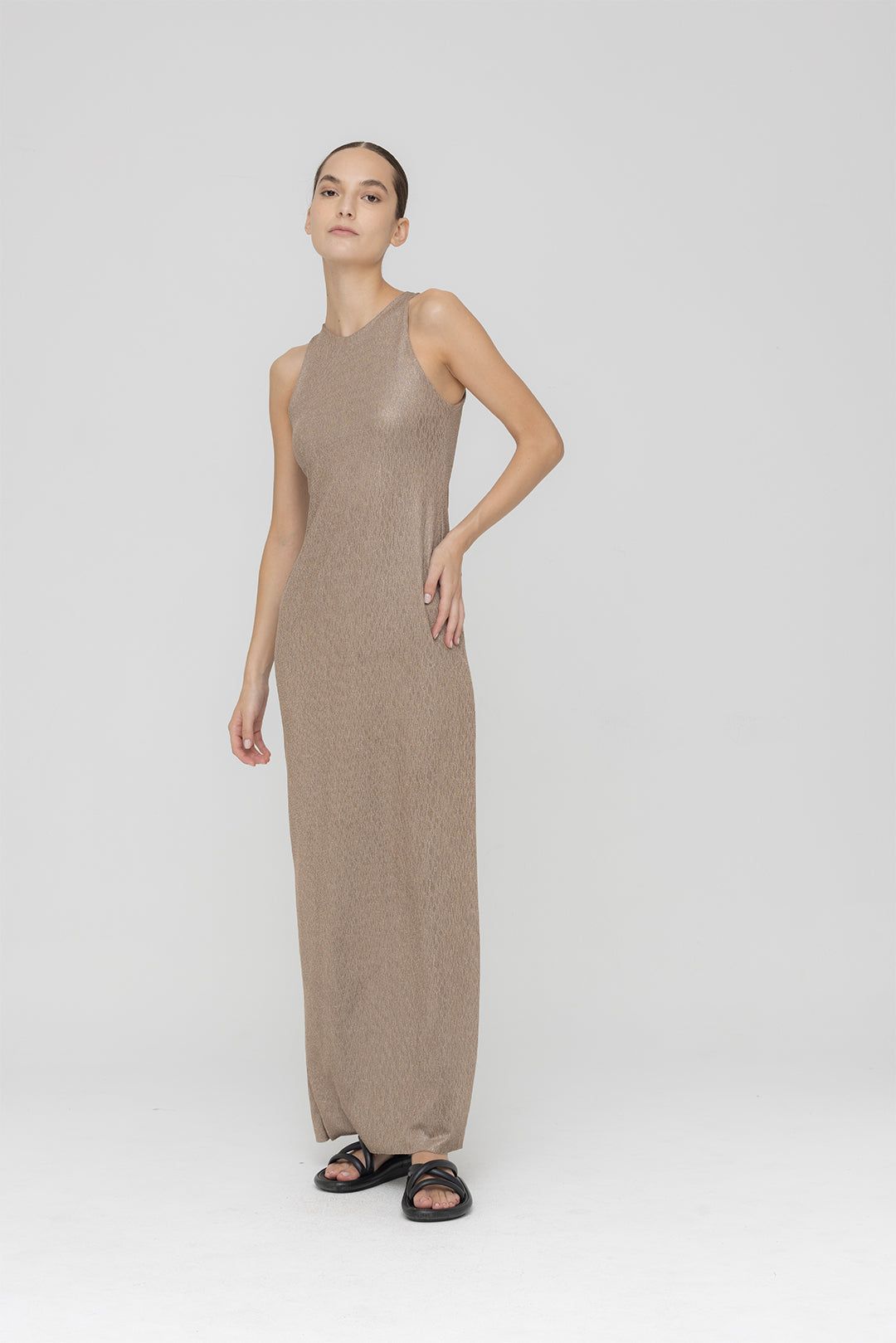 Vestido maxi de licra espejo, un diseño clásico ideal para lucir tanto en la ciudad como en la playa.